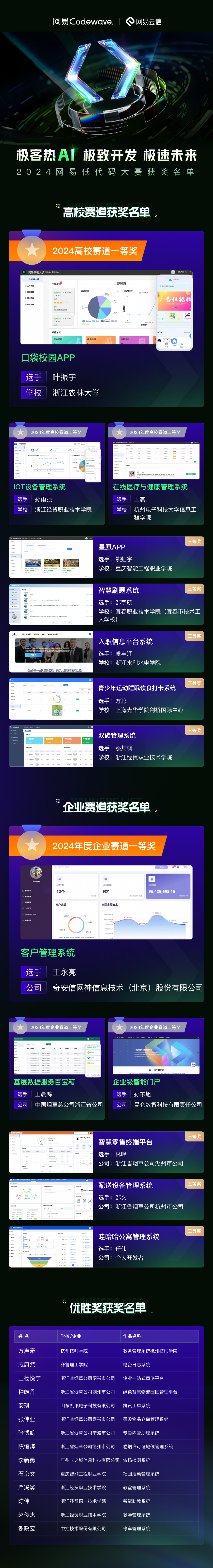 低代码是近年来技术领域比较火的关键词之一,凭借降低开发门槛、提高开发效率、增强定制化能力等优势,成为众多企业选择快速应对业务变化和需求创新的途径之一,也让低代码人才成为开发者圈里的“香饽饽”。在此背景下,网易连续三年设立网易低代码大赛,以赛促学,推广并普及低代码开发技术,培育新一代的应用开发人才。本届网易低代码大赛自9月6日正式开启以来,各路开发者利用低代码开发的高效率和便捷性,创作出超200个令人印象深刻的作品,参赛者通过将即时通讯(IM)、音视频通话(RTC)与低代码结合,成功构建出多个具有高互动性、趣味性、场景创新的应用。